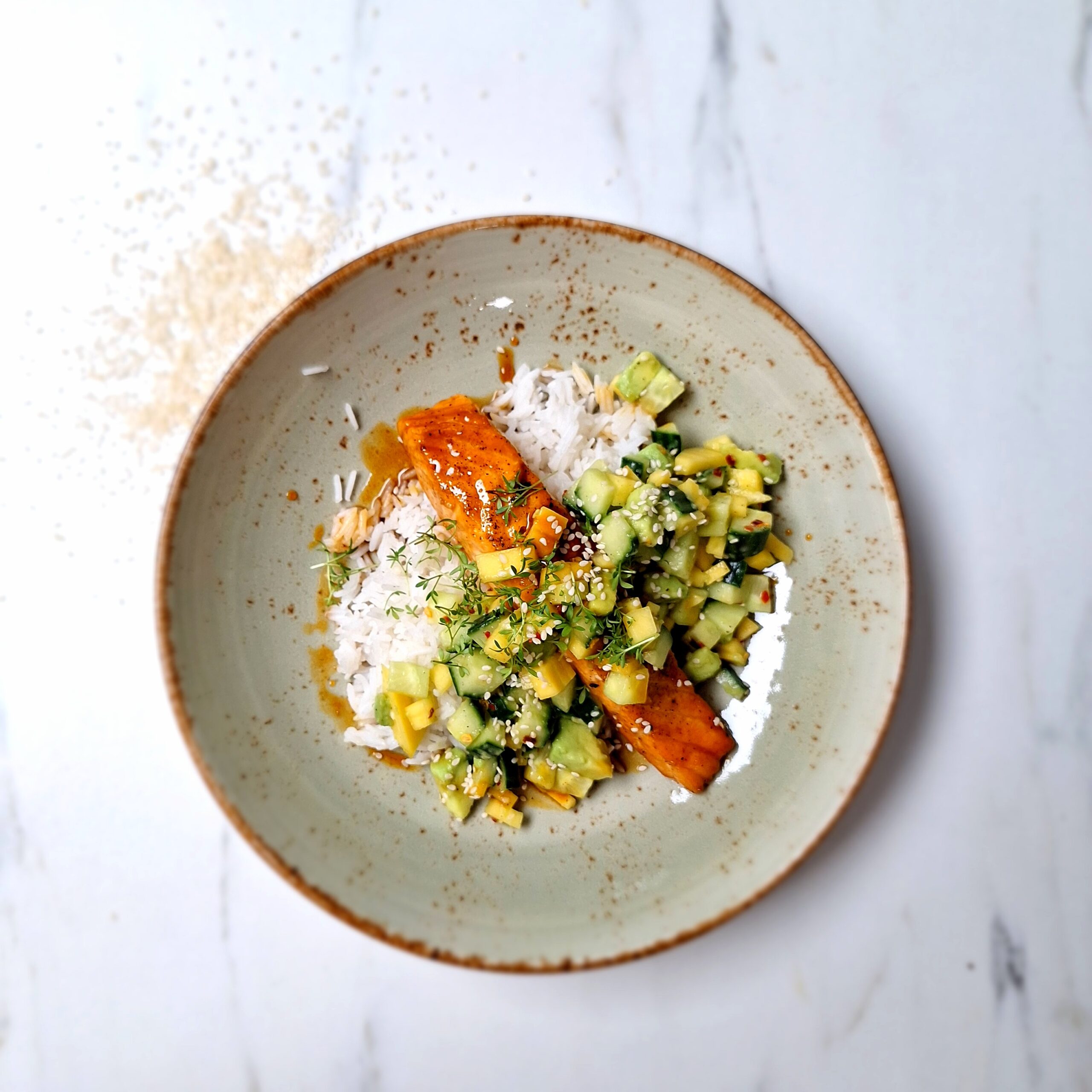 Hoe je een lekker stukje zalm nog lekkerder kan maken met de juiste marinade. Ik hou ervan om zout en zoet te combineren. Dit recept is daar een perfect voorbeeld van. De sinaasappel van de saus en de mango van de salade in combinatie met soja. A match made in heaven wat mij betreft.