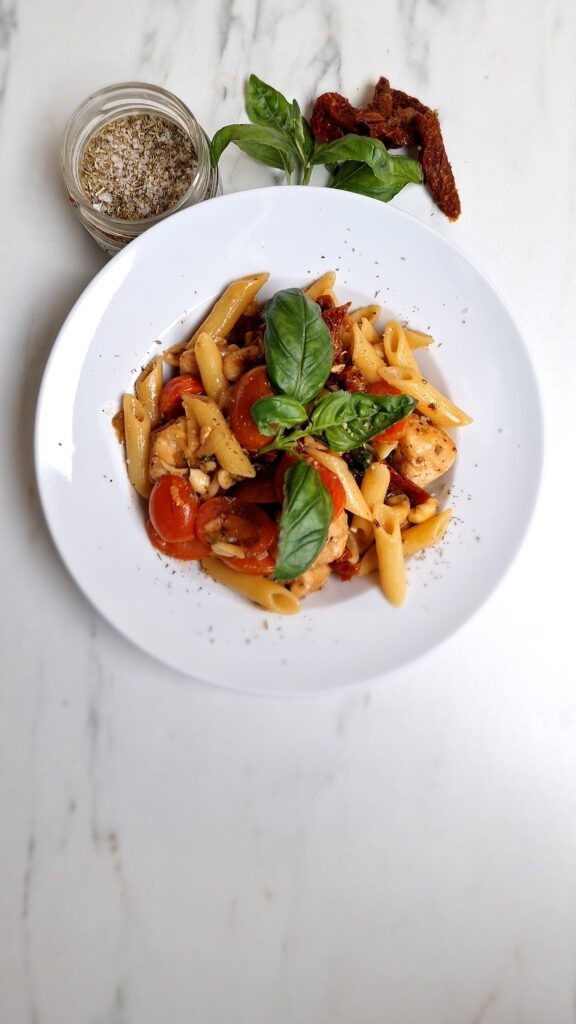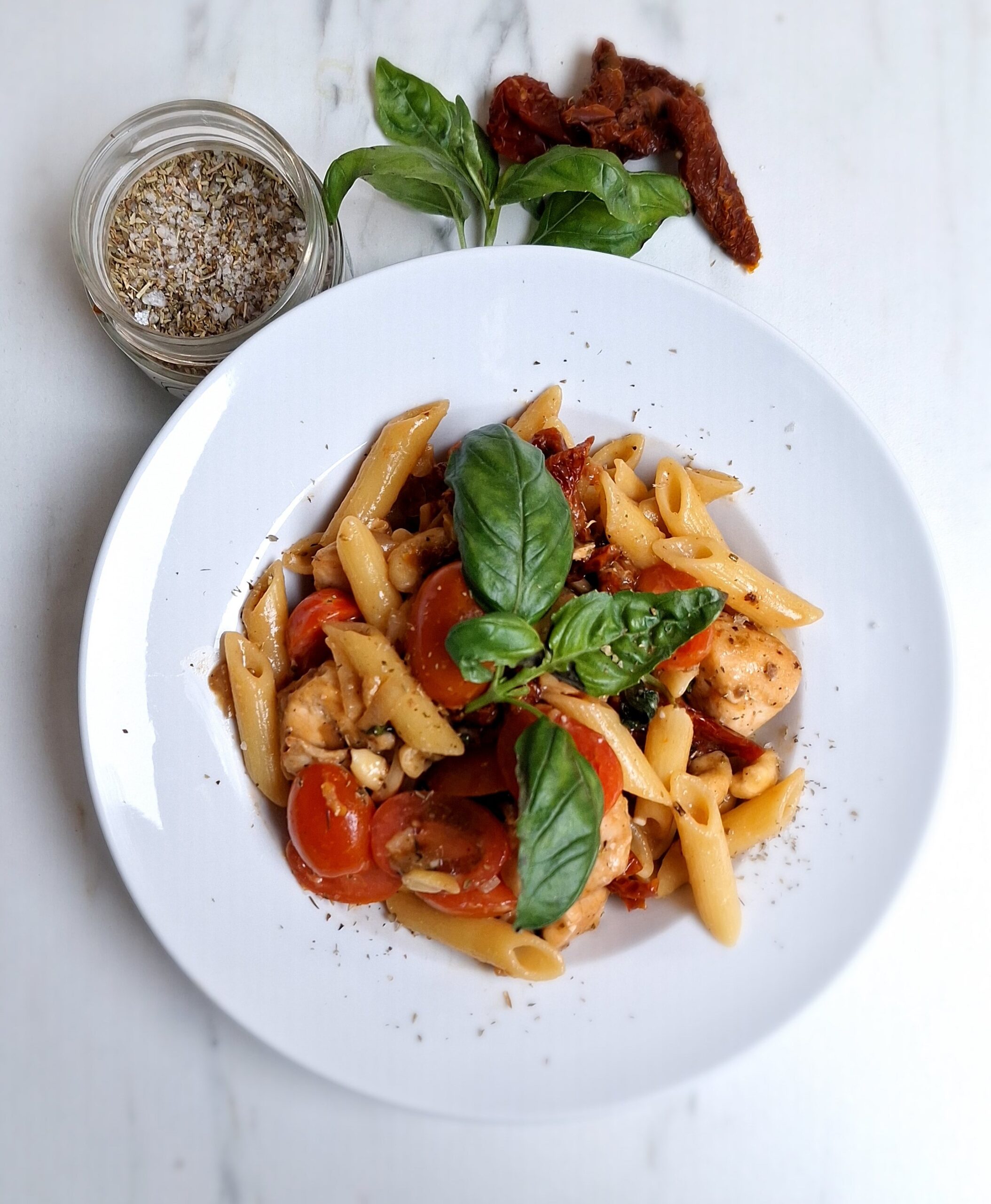 Snelle pasta kip met tomaten en cashews