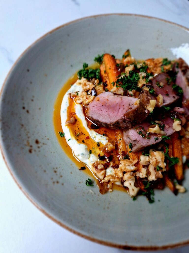 Je kan het vlees gewoon verder garen in de pan of je kan het ook verder laten garen in de oven samen de wortels. Idealiter heb je een vleesthermometer in huis en haal je het vlees uit de pan of de oven wanneer de kerntemperatuur ongeveer 53 graden bereikt (eet je je vlees liever wat meer gebakken, gaar dan verder naar 63 graden). Geen thermometer? Laat het vlees dan na het aanbakken nog gedurende tien tot vijftien minuten verder garen op een laag vuur (twintig minuten indien het wat meer gebakken mag zijn).